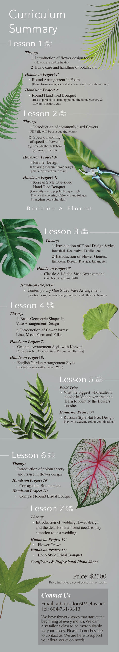 The curriculum consists of seven 6 hour sessions, including 40 minutes of theory lectures and 2 hands-on projects which can be taken home to display. These classes are small and intimate, so as to ensure the students will have quality one on one time with the teacher for more detailed guidance. Students will receive an apron, as well as, the necessary design tools they need to complete their floral design projects. During each session, we will take photographs for the students of their progress and finished products to help document their experience.