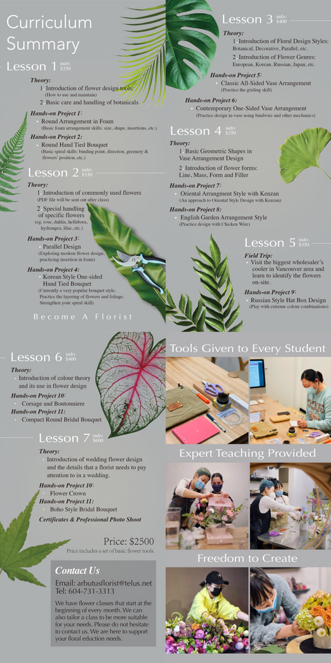 If you love the beauty, colour and the mystery of flowers, Arbutus Florist offers the right class for you. Fear not! You don't need to be a professional floral designer, or have any knowledge about floral design just a desire and a passion to use your imagination and creativity.The classes are part theory, you learn about different designs from the very traditional to the ultra modern, and you gain a wealth of knowledge about the many varieties of flowers to use when designing.From day one you will work with flowers in their many forms, fresh, treated and dried. The instruction is truly incredible.My instructor - the awesome Brenna Quan is so creative, and so patient, and so willing to share information about the industry and how she works. I looked so forward to each week's class and entering the zen like atmosphere at the shop. Oh and least I forget, Arbutus Florist takes professional pictures of your designs, and you get to keep not only what you make in class, but the pictures too. Hands down this is an incredible course.